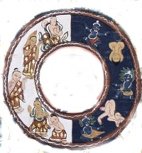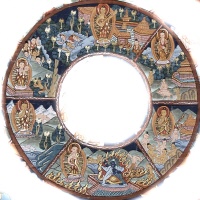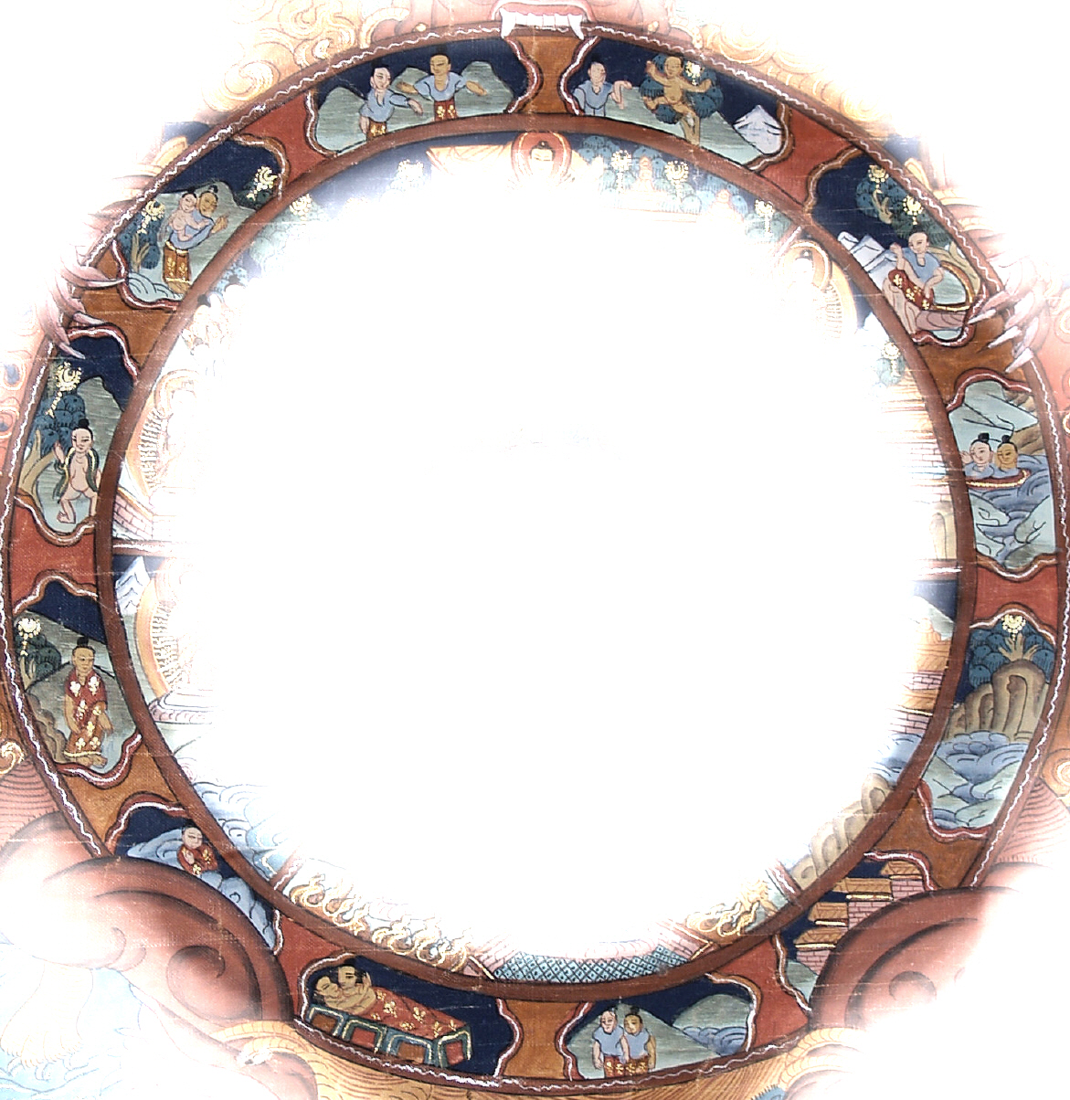 An tibetischen Tempeln hängt häufig an der Außenwand ein Bild des Lebenrades. Es symbolisiert die samsarische Welt welche symbolisch mit dem Eintreten in den Tempel hin zur Erlösung verlassen wird.