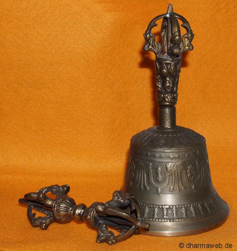 Die Glocke. Sinnbild der Vergänglichkeit, des weiblichen Prinzips, welches Weisheit und das Ziel repräsentiert. Äquivalent zum Dorje, der u.a. den Weg repräsentiert. Zusammen stellen Dorje und Ghanta die Vereinigung der Attribute: Der Weg und das Ziel sind eins.