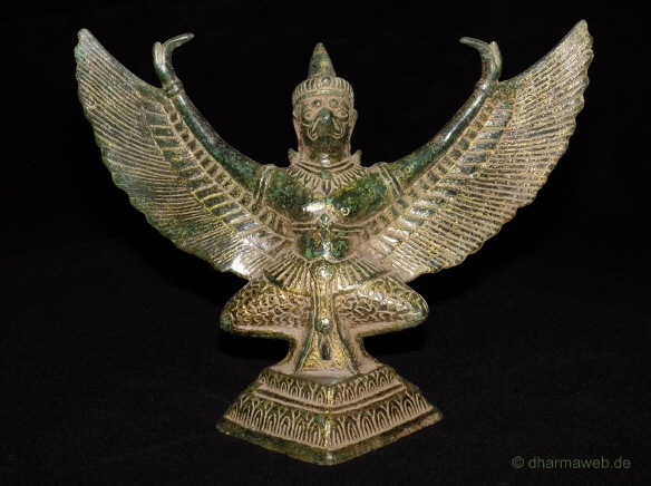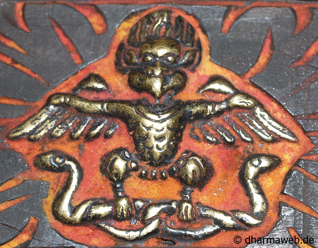 Mythischer König der Vögel. Eine ursprünglich aus der hinduistischen Mythologie stammende Figur, halb Mensch halb Vogel. Im tibetischen verschmolz die Mythologie mit Khading, dem "gehörnten Goldadler" der Bön-Mythologie Tibets. Der Garuda ist das Reittier Amoghasiddhi's (tib. Donyod Dupoa=Unterschütterliche Kraft), welcher zu den fünf Dhyani Buddhas gehört.