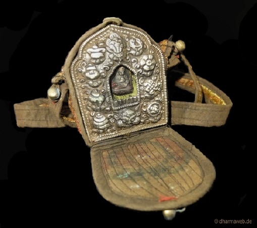 Eine kleiner tragebarer „Altar„bzw. Schutzamulet. Ein Ghau enthält oftmals eine kleine Buddha-Statue hinter kunstvoll umrandetem Glas. Im das Inneren des Ghau werden Heilkräuter, Teile von Gebetsfahnen und andere zum Teil geweihte Gegenstände eingesetzt. Außen sind sie oft mit den 8 glücksbringenden oder Darstellungen von Drachen verziert. Kleine Ghaus (siehe Foto) werden um den Hals oder am Gürtel getragen. Größere Ghaus werden zusätzlich in eine Stoff oder Lederhüller gearbeitet und mit einem Gurt über der Schulter oder auf dem Rücken transportiert. AM Zielort angekommen dienen sie als „mobiler Altar„oder werden auf einem bestehenden Altar gestellt.