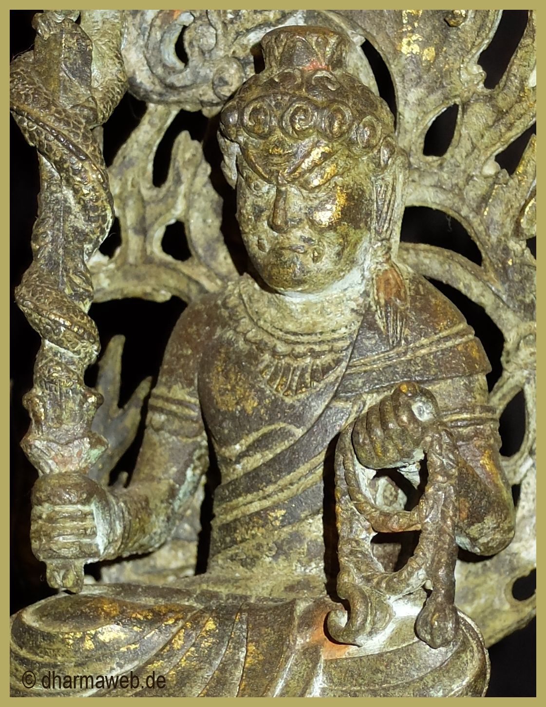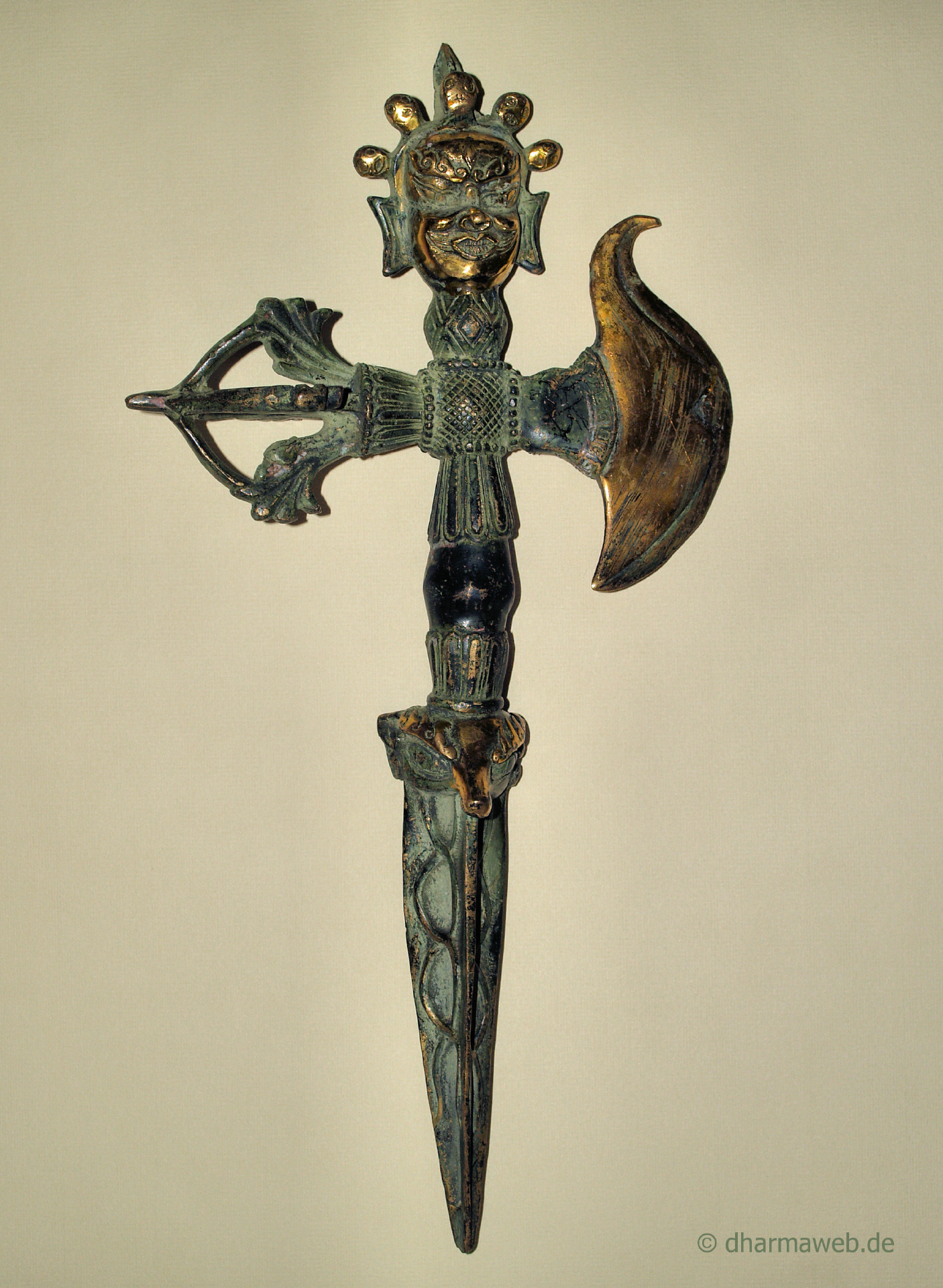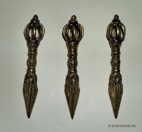 Die Seiten der dreischneidigen Klinge sollen die drei Geistesgifte (Unwissenheit, Gier und Hass) durchtrennen.