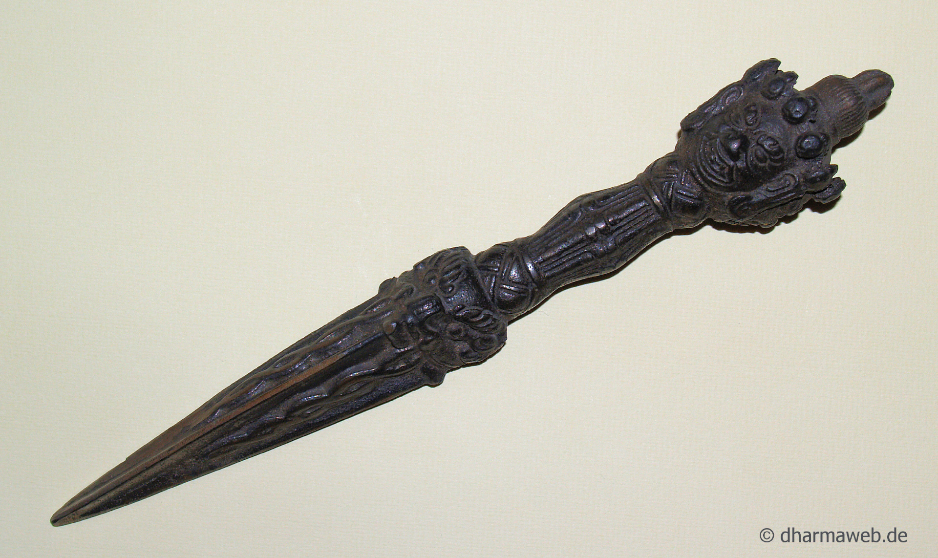 (Bild 1) Klassischer Eisen-Phurba, Griff mit Geflecht-Struktur und dreigesichtigem Knauf.