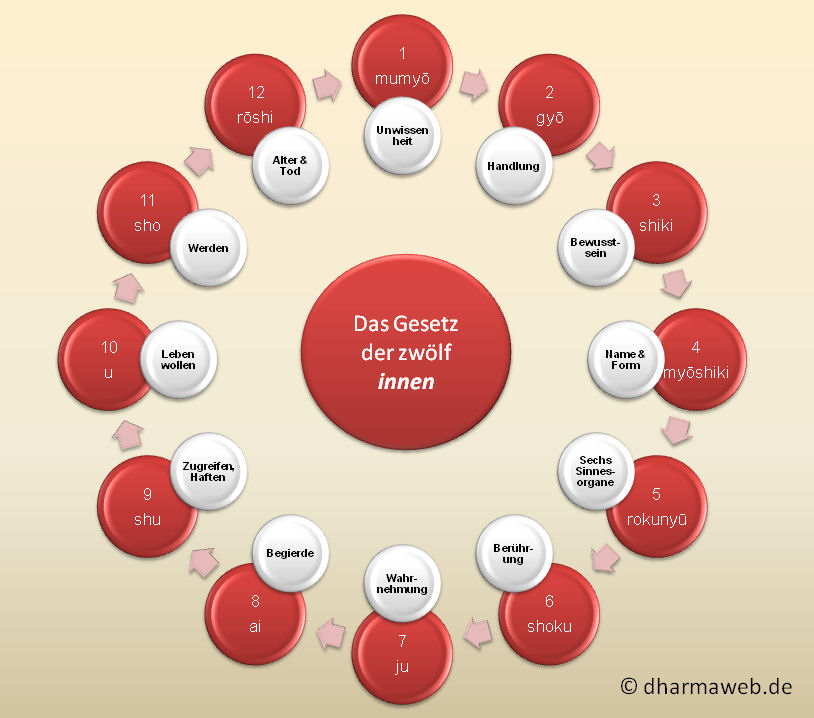 1) Unwissenheit mumyo (jap), avidya (skt) 2) Handlung gyo (jap), samskarakarma (skt) 3) Bewusstsein shiki (jap), vijnana (skt) 4) Name & Form myoshiki (jap), namarupa (skt) 5) Sechs Sinnesorgane rokunyu (jap), sadayatana (skt) 6) Berührung shoku (jap), sparsa (skt) 7) Wahrnehmung ju (jap), vedana (skt) 8) Begierde ai (jap), trsna (skt) 9) Zugreifen, Halten shu (jap), upadana (skt) 10) Leben wollen u (jap), bhava (skt) 11) Werden sho (jap), jati (skt) 12) Alter & Tod roshi (jap), jaramarana (skt)