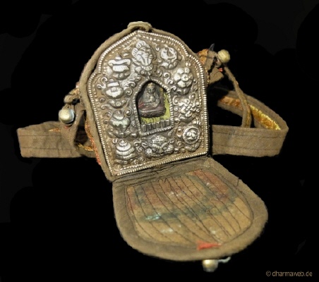 Eine kleiner tragebarer „Altar„bzw. Schutzamulet. Ein Ghau enthält oftmals eine kleine Buddha-Statue hinter kunstvoll umrandetem Glas. Im das Inneren des Ghau werden Heilkräuter, Teile von Gebetsfahnen und andere zum Teil geweihte Gegenstände eingesetzt. Außen sind sie oft mit den 8 glücksbringenden oder Darstellungen von Drachen verziert. Kleine Ghaus (siehe Foto) werden um den Hals oder am Gürtel getragen. Größere Ghaus werden zusätzlich in eine Stoff oder Lederhüller gearbeitet und mit einem Gurt über der Schulter oder auf dem Rücken transportiert. AM Zielort angekommen dienen sie als „mobiler Altar„oder werden auf einem bestehenden Altar gestellt.