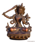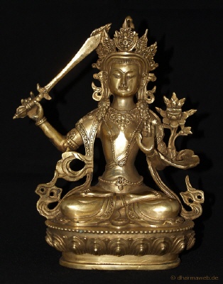 (jap. Monju) wörtlich „Der edel und sanft ist„. Manjushri ist der Boddhisattva der Weisheit. Seine Attribute sind das flammende Schwert der Weisheit (Khadga) in der Rechten und der blühende Lotos mit zusammengebundenem Sutra-Text (Prajnaparamita-Sutras), welche auf der Blüte ruhen, in der Linken. Auf dem Kopf trägt er die fünfzackige Boddhisattva-Krone. Diese symbolisiert die fünf Erleuchtungsweisheiten des Buddha (spiegelgleiche Weisheit, wesensgleiche Weisheit, unterscheidende Weisheit, alles vollendende Weisheit und die allumfassende, transzendente Weisheit).