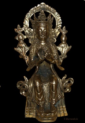 tib. byams pa, "Der Liebende" Maytreya ist die Verkörperung der allumfassenden Liebe und gehört zu den fünf irdischen Buddhas. er ist der 5. Buddha dies Äons und Buddha der Zukunft, der in ca 30.000 Jahren und Erscheinung treten wird. Bis dahin verweilt er im sog. Tushita-Himmel. Ikonographisch wird er oft sitzend, mit auf dem Boden ruhenden Füßen dargestellt. Dies soll andeuten, dass er seine endgültige Position (da in der Zukunft) noch nicht eingenommen hat. Andere Darstellungen sind in stehender Form oder als Hotai.