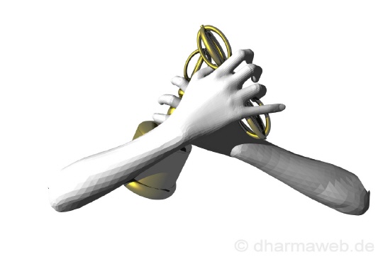 Vajrahumkara Mudra Geste der Vereinigung der Attribute. Hierbei werden Vajra und Ghanta gekreuzt. Weg und Ziel sind eins. |